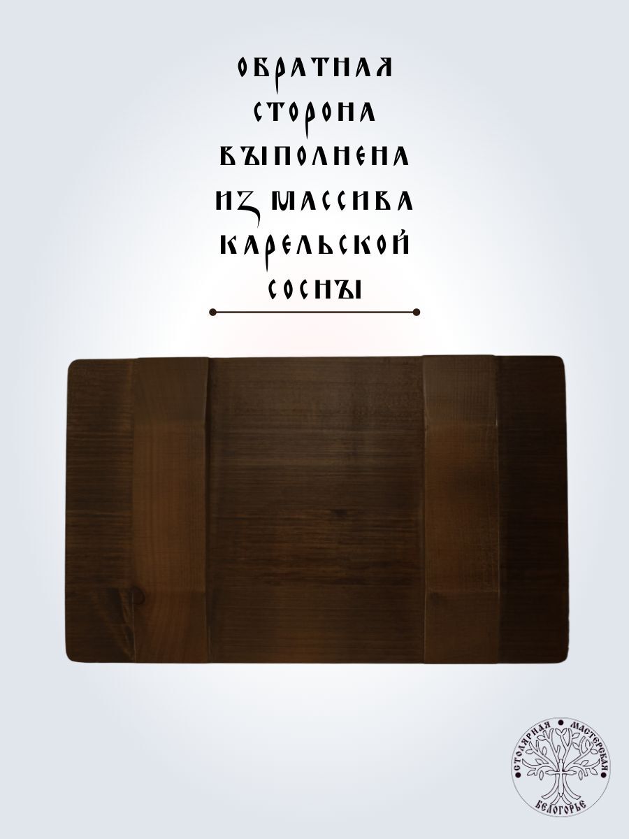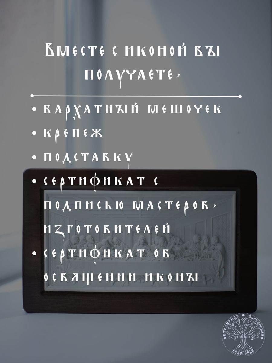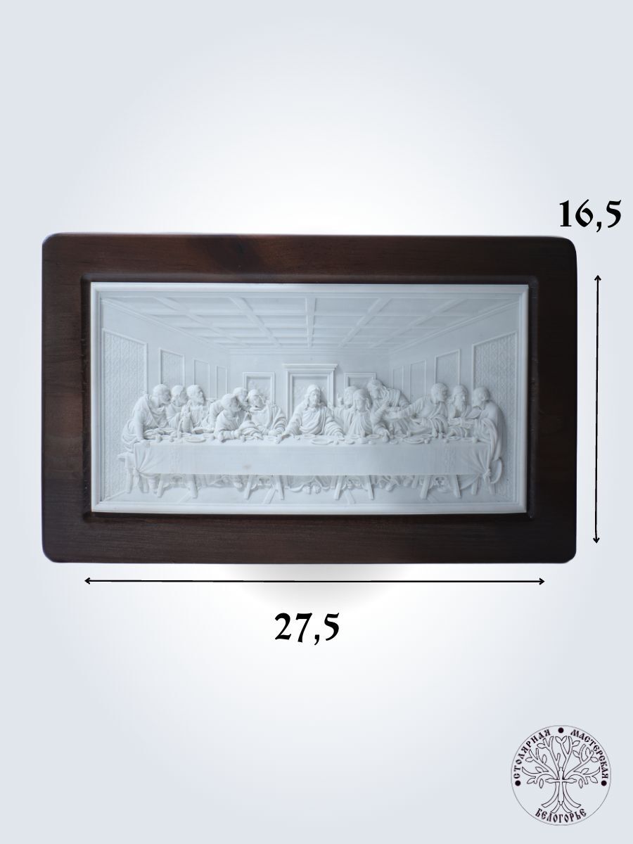 Икона Тайная Вечеря изготовлена из высококачественных материалов, что обеспечивает ее долговечность и сохранность цвета. Она имеет размеры 27,5x16,5 см, что делает ее удобной для установки на стол, полку, камин или подвески на стену.